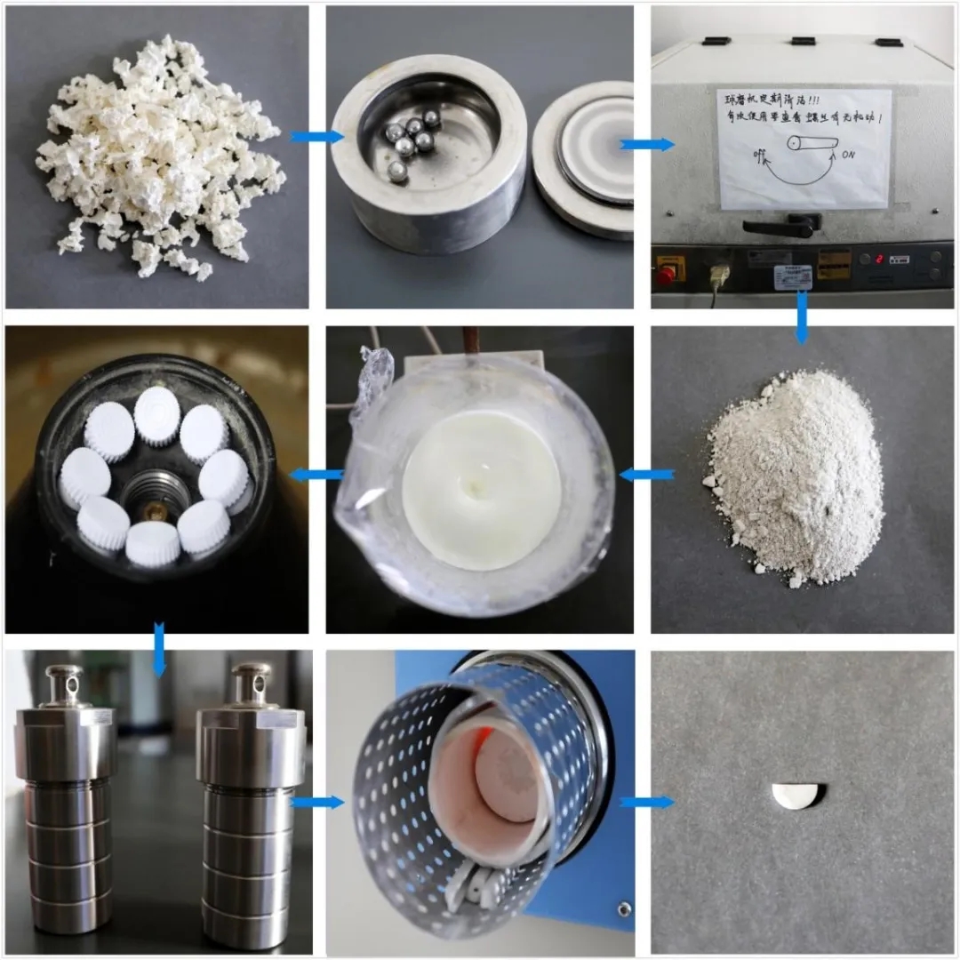 團隊目前使用的主要制備方法:將氧化鋁陶瓷粗料裝入磨料盒——用行星式球磨機磨制20小時以上得到納米級顆粒——裝入不同濃度的鹽酸中進行分離沉降——將沉淀液放入試管——離心機離心——得到尺寸相近的納米剛玉顆粒干燥后得到粉末——將粉末裝入模具壓制——高溫煅燒——得到圓形的細晶氧化鋁納米晶陶瓷
