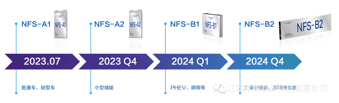 根據硫酸鐵鈉材料性能,結合市場實際需求與產業化目標,眾鈉能源在2023-2024年度將市場推出4款鈉電產品,分別為:面向低速車/輕型車市場的軟包電芯NFS-A1、面向小型儲能市場的軟包電芯NFS-A2 、面向PHEV/調頻市場的方殼電芯NFS-B1,面向工商儲/源網側儲能市場的方殼電芯NFS-B2。