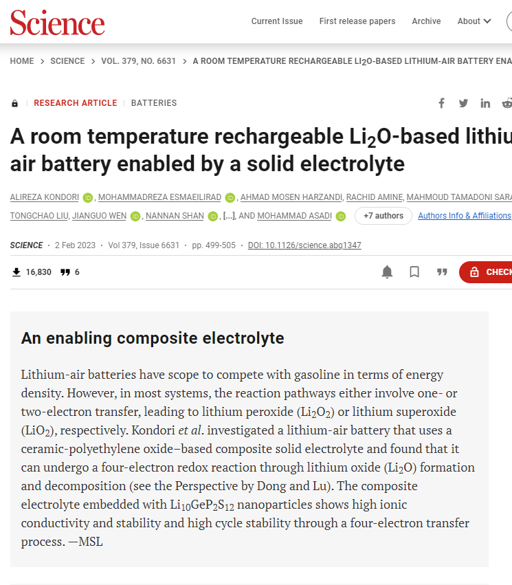 伊利諾亞理工學院的Mohammad Asadi教授和阿貢國家實驗室Larry A. Curtiss教授通過在基于Li10GeP2S12納米顆粒嵌入改性聚氧化乙烯聚合物基體的復合聚合物電解質中,發現了Li2O是室溫固態鋰-空氣電池的主要產物。該電池可循環充電1000次,極化間隙小,可高速運行。四電子反應是由混合離子-電子-導電的放電產物及其與空氣的界面促成的。這一發現為在室溫下實現鋰基化學提供了新的設計機會,而且電池的能量密度遠遠高于目前鋰離子技術所能提供的。相關成果以“A room temperature rechargeable Li2O-based lithium-air battery enabled by a solid electrolyte”為題發表在《Science》上。