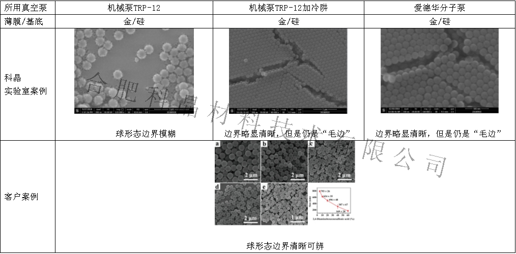 對比結論:客戶所做案例球形態清晰,顆粒與顆粒間分界清晰,實驗室所做三組案例,雖然冷阱(第2組)及干泵(第3組)的效果略比油泵(第1組)效果改善,但是對比客戶的案例仍有很大差距,所以實驗室做了以下對比:三種工況下鍍金金膜質量(濺射儀使用機械泵TRP-12、濺射儀使用機械泵TRP-12加冷阱、濺射儀使用愛德華分子泵):