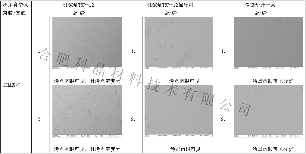案例②總結:從三組6個樣品中看出,干泵(第3組)效果>油泵+冷阱(第2組)>油泵(第1組),其中第三組單位面積污點數量最少,由此看出冷阱對鍍膜的效果改善比較的明顯,干泵鍍膜質量最好。