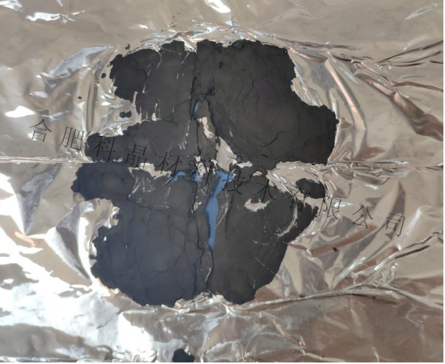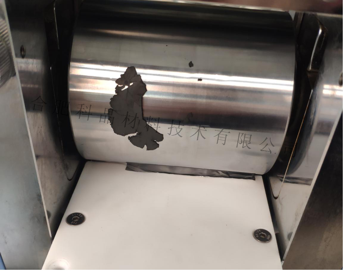 (1)三元正極材料在數(shù)次改變溫度,壓力,時(shí)長等參數(shù)后,壓制的樣品依然出現(xiàn)斷裂(圖1),粘輥(圖2),延展性極差(圖3)等現(xiàn)象。說明三元正極材料配比存在問題,需要進(jìn)一步調(diào)整。