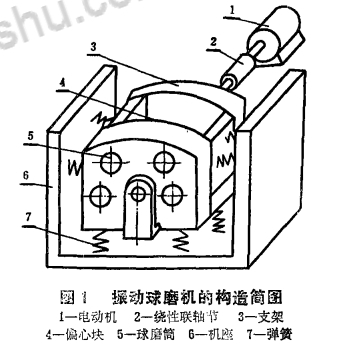 電動機通過繞性聯軸節帶動裝有偏心塊的軸產生振動,傳給支架。支架上裝有球磨筒,于是跟著振動。支架的
