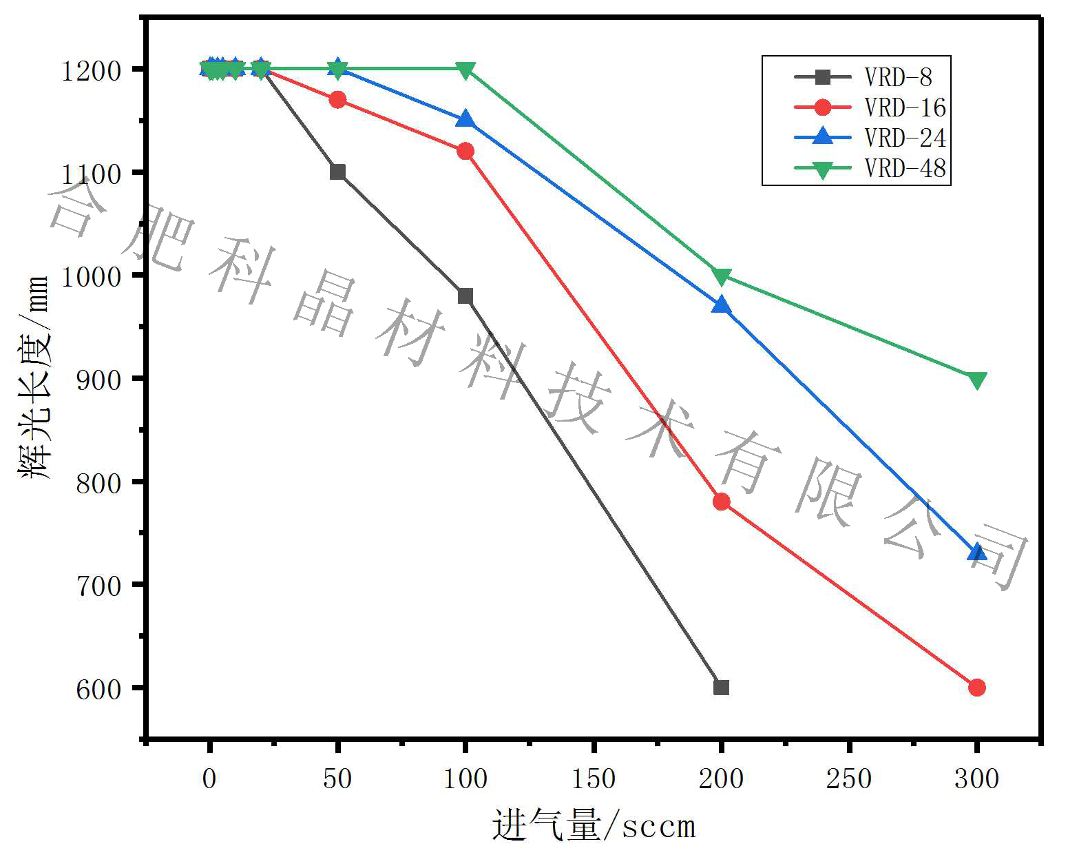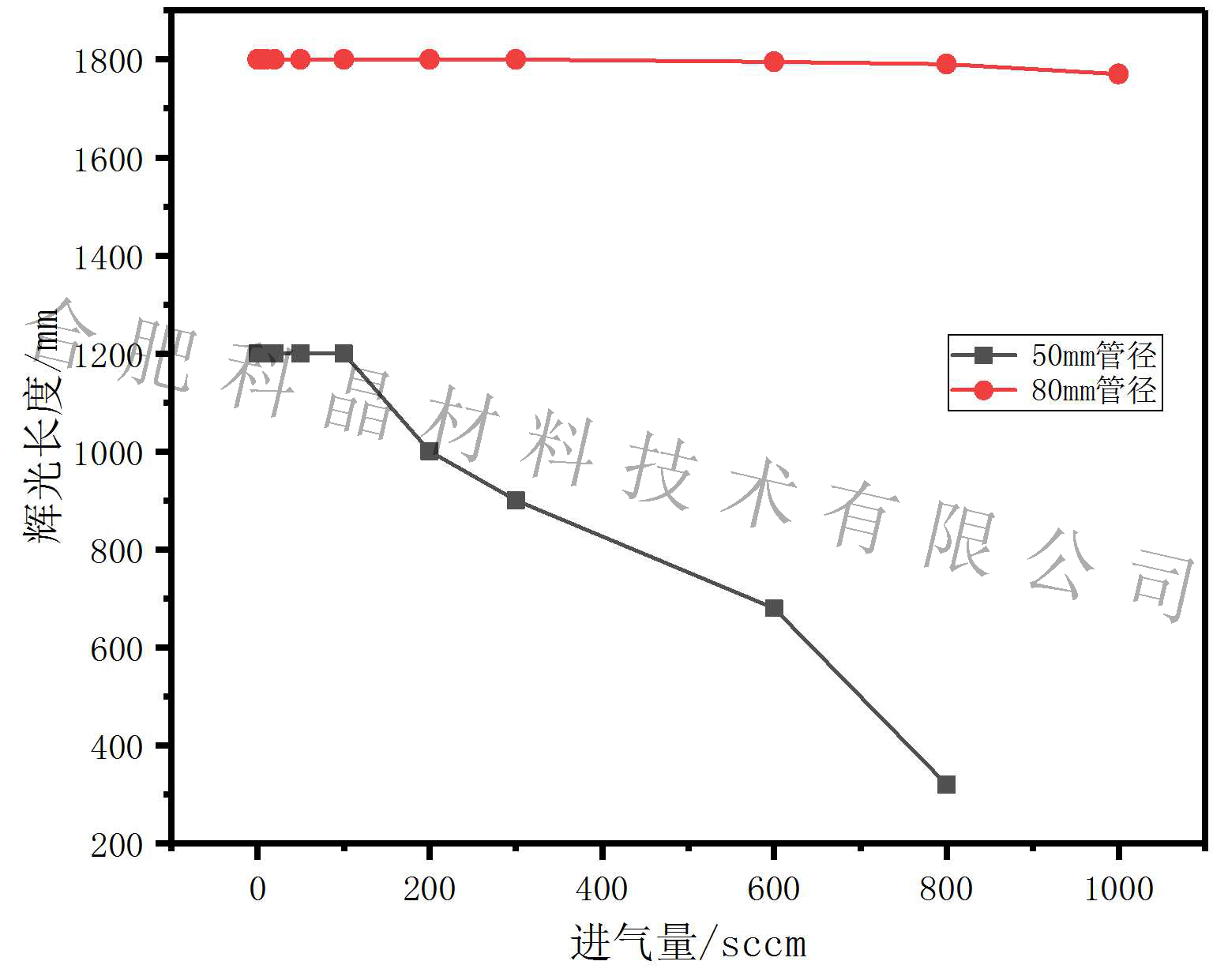 使用VRD-8和VRD-16,進氣端靠近線圈時,進氣量≦20sccm,輝光可充滿全管,而進氣端遠離線圈時,需要進氣量≦3sccm;