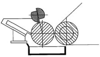 工作原理如圖1所示,箔基材經(jīng)過涂布輥并直接與漿料料槽接觸,過量的漿料涂在箔基材上,在基材通過涂輥與刮刀之間時,刮刀與基材之間的間隙決定了涂層厚度,同時將多余的漿料刮掉回流,并由此在基材表面形成一層均勻的涂層。刮刀類型主要逗號刮刀。逗號刮刀是涂布頭中的關(guān)鍵部件之一,一般在圓輥表面沿母線加工成形似逗號的刃口,這種刮刀具有高的強度和硬度,易于控制涂布量和涂布精度,適用于高固含量和高黏度的漿料。