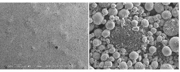1.3團聚體顆粒凸起:如果漿料攪拌不均勻,導(dǎo)電劑沒有分散開,形成團聚體時就會產(chǎn)生此類缺陷,如圖5所示,極片表面出現(xiàn)大面積的凸起,放大這些地方觀察,發(fā)現(xiàn)這是導(dǎo)電劑的團聚體。這種缺陷主要還是改善漿料攪拌工藝來消除。