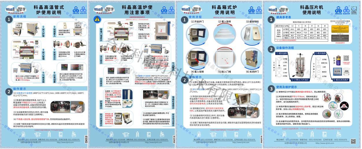 合肥科晶材料技術有限公司擁有混、壓、燒、切、磨、拋一系列完整的材料制備設備,閱讀這些掛畫可以大大降低您的設備磨合時間,同時仔細閱讀相關安全提示,將會更好的保護您的生命和財產安全。