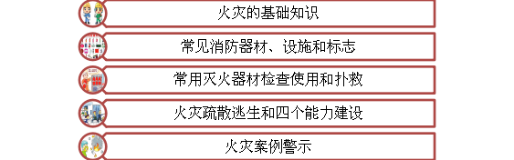 首先由專業(yè)培訓(xùn)講師講解火災(zāi)安全相關(guān)知識,包括五個方面: