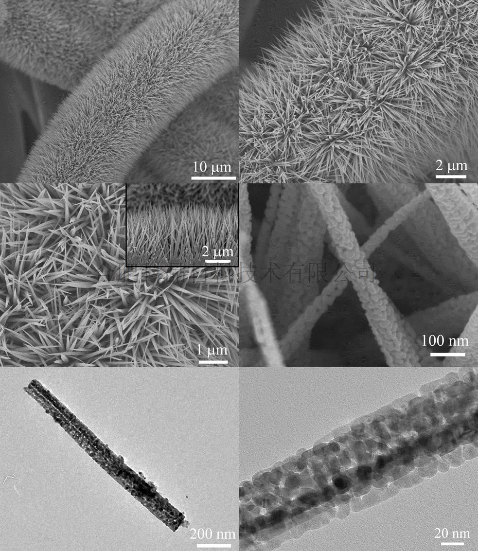 介孔四氧化三鈷納米線陣列,經水熱方法合成,可以在多種導電和非導電基地(如碳布、泡沫鎳、鈦片、鎳片、不銹鋼片、石墨、泡沫石墨烯、玻璃等)上生長。 納米線平均直徑80-100nm,納米線由相互交聯的粒徑為4-5nm的納米顆粒構成,且納米顆粒間的空隙約為3-5nm。 陣列整體長度約為5 微米。 樣品宏觀尺寸不超過寬度3.5厘米′長度4.5厘米,介孔四氧化三鈷納米線陣列宏觀色澤呈黑色。
