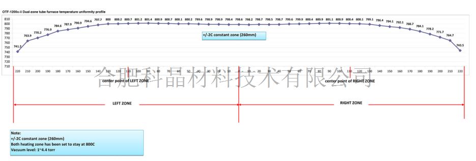 雙溫區(qū)管式爐:兩個獨(dú)立的溫控系統(tǒng)分別獨(dú)立控制兩個溫區(qū) 加熱區(qū)長度:溫區(qū)1:200mm, 溫區(qū)2:200mm 爐管材料:高純石英 爐管尺寸:外徑: 60 ×內(nèi)徑: 54×長: 760 mm 溫度曲線圖(兩個溫區(qū)設(shè)置在800℃時所測,僅供參考)(可點擊圖片查看詳細(xì)資料))