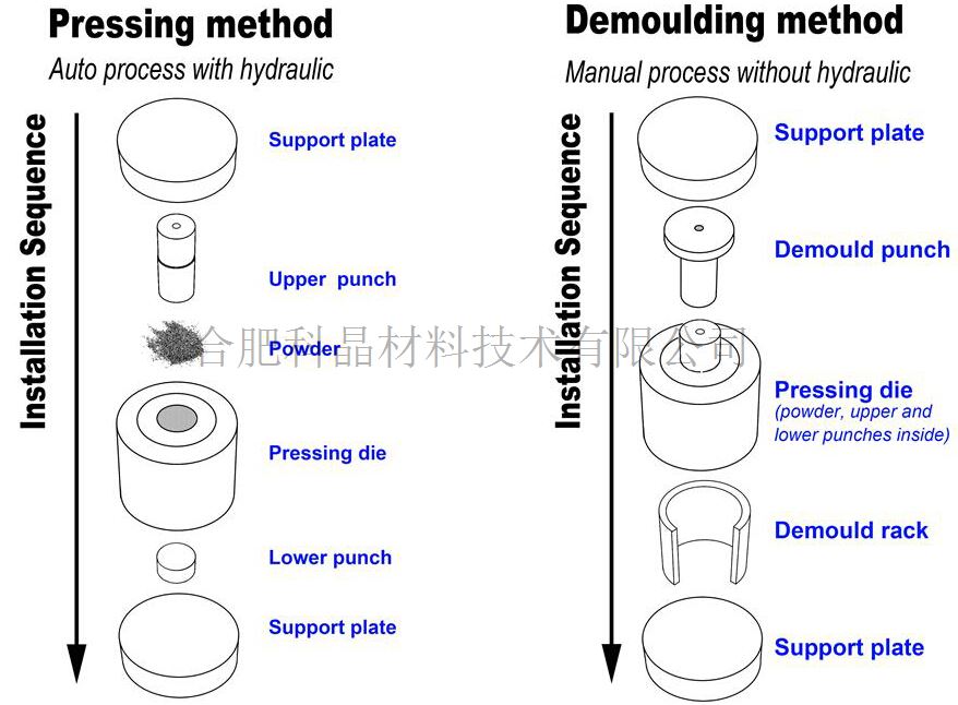 · 開始加壓時必須關上防護罩,若壓力機沒有防護罩,實驗人員必須佩戴防護罩(本公司的壓力機都安裝有防護罩) · 所壓粉末的粒度不可小于30um,若粉末粒度過小,加壓時粉末會滲入到壓桿和模具套筒內壁之間的間隙中,這樣會引起模具的損壞。 · 建議球磨和篩分后的粉末粒度控制在32~75um,請使用200目和450目的篩網對粉末進行篩分,取中間32~75um的粉末(可在本公司購買篩網),然后再進行粉末制片. · 每次使用前請用酒精清洗模具,使用后請將模具擦干凈,涂上防銹油,放置 ·