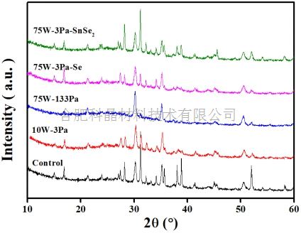 75W、3Pa且補充0.02g SnSe2粉末(10%質量比Sb2Se3)沉積Sb2Se3 | Sn: 22.78 Sb: 25.77 | 51.44 | ||
