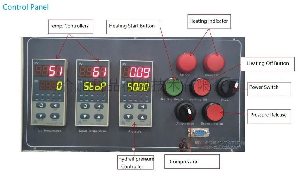 | 溫度控制器和壓力顯示 | · 2個精密溫度控制器,分別控制2個加熱平板,可設(shè)置30個溫度段,控溫精度+/-1℃ · 溫度控制系統(tǒng)帶有PID自整定功能,超溫保護(hù),和斷熱電偶保護(hù)。 · 最高溫度:500℃ · 最大加熱速率:2.5℃/min · 一個數(shù)顯壓力計(jì)(控制器)安裝在控制面板上??蛻艨稍O(shè)置壓力值,當(dāng)壓力到到達(dá)設(shè)定值時,電動液壓缸自動停止運(yùn)行。 |