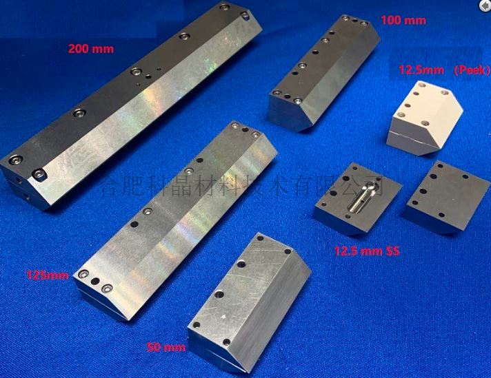 1. 100mm寬度的刮刀,安裝2個微米級調節頭(圖1),可涂布厚度范圍0.01mm-5mm 2. 50mm寬度擠壓頭,可固定在刮刀上,可涂布厚度0.005mm-0.02mm(涂布漿料需要調節粘度)(圖1)擠壓頭包含以下配件 · 2 片厚度0.2mm的不銹鋼墊片 · 2 片厚度0.3 mm 的不銹鋼墊片 · 2 片厚度0.4 mm 的不銹鋼墊片 · 1 根PTFE 管 ( 3.175外徑 x 2.175 mm 內徑) · 連接頭,用于連接注射泵和擠壓頭 3. 其他寬度擠壓頭可安裝在刮刀上(12.5mm或30mm)(圖2) 4. PTFE緩沖板安裝在整體框架底部,用于減小摩擦力(圖3)