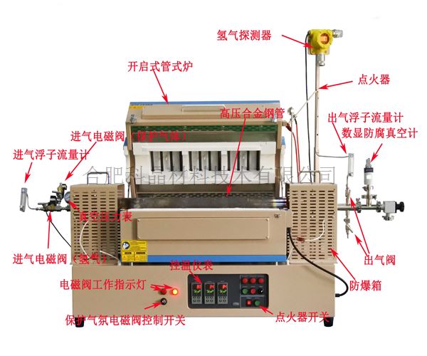 | 進氣和出氣系統 | ·進氣端安裝有一個浮子流量計和進氣電磁閥,當檢測系統檢測到氫氣泄露時將自動關閉進氣電磁閥。 同時出氣端安裝有一個電子點火器,用于對氫氣燒結進行電子點火; ·出氣端安裝有一個浮子流量計,浮子流量計量程0.2-2L/min ·爐管兩端漏出爐子部分,安裝有防護網 |