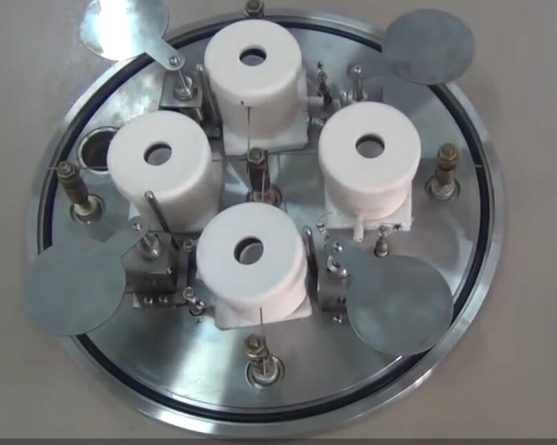 | 產品特點 | · 含有四個蒸發坩堝,可鍍膜4種不同的物料 · 每個坩堝上方均有擋板,保證了蒸發物料之間不相互污染 · 采用鎢絲藍為發熱源,最高溫度可到1500度 · 可旋轉樣品臺,保證了薄膜的均勻性 |