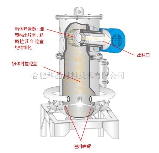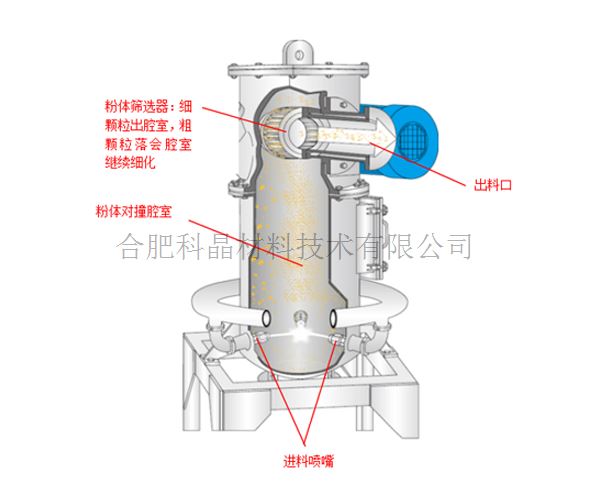 流化床式氣流磨是通過高速噴射的壓縮空氣或惰性氣體,使顆粒之間成2倍相對速度碰撞,針對與超硬粉體細化,輸出達到細化要求的尺寸顆粒出料,抑制未達到出料要求的顆粒,所以所得粉體分布比較集中,顆粒尺寸均勻,一般配有旋風分離系統,將不同粒徑的粉體進一步分離。
