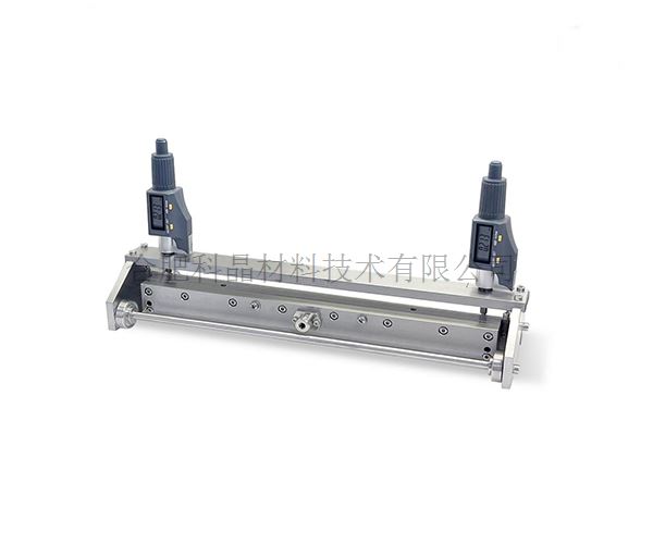 ·一個(gè)300mm寬的擠壓頭安裝在一個(gè)可移動的支架上,支架底部安裝有4個(gè)精密滾輪 ·涂布機(jī)推桿推動移動支架和擠壓頭在涂布機(jī)的真空平板上移動,將漿料均勻涂布在基底上, 而且移動支架和擠壓頭都不接觸基底 ·擠壓頭與基底之間的間隙通過兩個(gè)數(shù)顯千分表調(diào)節(jié),數(shù)顯千分表精度為±1um ·配有2套不銹鋼墊片,3種不同厚度0.2mm,0.3mm和0.4mm