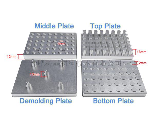 | 尺寸&(最大承受壓力) | 單工位的內徑:10 mm 單工位容量:0.6 ml 單工位最大承受壓力:90MPa9工位:長50mm*寬50mm*高30mm(6.3噸) 16工位: 長60mm*寬60mm*高30mm (11.2噸) 25工位: 長75mm*寬*75mm*高30mm (18噸) 36工位: 長90mm*寬90mm*高30mm (25噸) 48工位: 長133mm*寬100mm*高30 mm (33.6噸) |