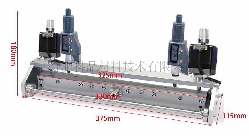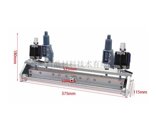 ·擠壓頭與基底非接觸式涂布 ·2個24直流電機驅動,自動調節擠壓頭與基底之間的間隙,調節精度為1um,可在Ar環境下的手套箱內使用 ·300mm寬擠壓頭安裝在框架上,框架上有4個滾輪,減少摩擦力 ·配有2套不銹鋼墊片,厚度為0.2mm,0.3mm和0.4mm