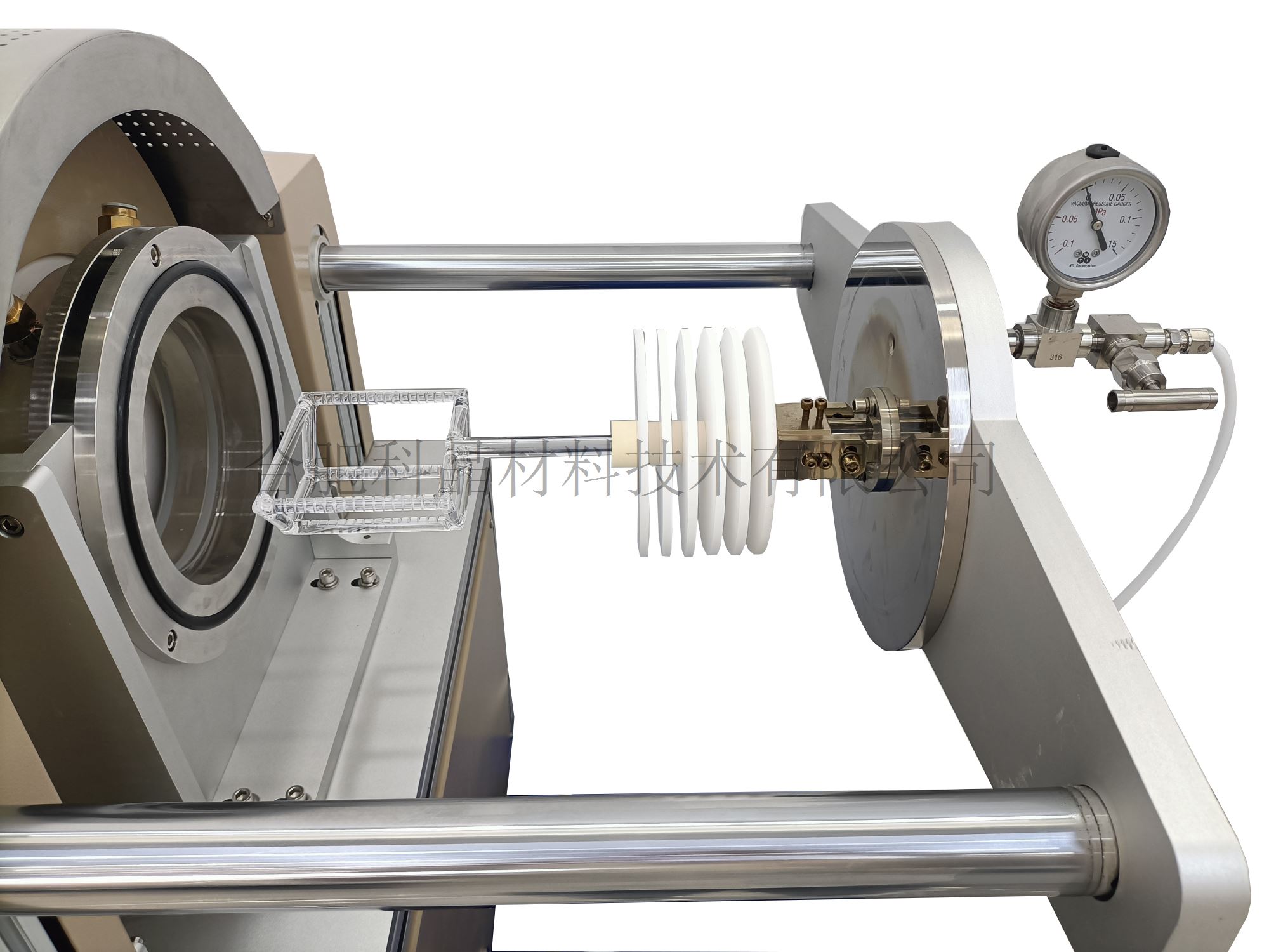 | 不銹鋼法蘭密封系統 /及接口設置 | ·一套6英寸全自動密封不銹鋼水冷法蘭,通過電缸進行恒壓力密封和自動開啟 ·設備需搭配水冷機使用(進出水口為φ12mm) ·右端法蘭留有一個G1/4雙卡套出氣口與設備內置出氣系統連接, 一個G1/4鎧裝熱電偶插入口用于檢測管內溫度 ·右邊法蘭內側有樣品放置平臺(支撐架尺寸詳見目錄 樣品臺支架) ·左邊留有KF25抽氣口用于連接真空泵,配有數顯真空計,一個G1/4進氣口。 ·設備帶有真空泵外接三芯插座和真空電磁擋板閥的外接航空插頭(將真空泵接入插座后,真空泵的運行和電磁擋板閥的開合由該系統自動控制) |