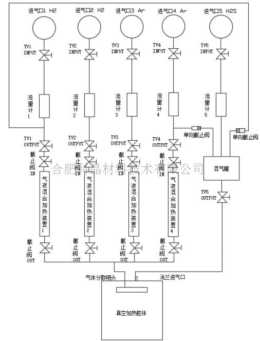 | 氣路控制系統(tǒng) | ·設(shè)備的整個氣路系統(tǒng)如下: ·5路供氣系統(tǒng),含有5個質(zhì)量流量計 ·一路、二路:0-50sccm(H2),三路、四路:0-500sccm(Ar) 五路:0-50sccm(H2S), ·第一路氫氣與第四路氬氣都分成2路,其中一路分別通入氣液混合加熱裝置1和2內(nèi),另一路與第五路氣體進(jìn)入混氣罐內(nèi)混合后通過法蘭上的進(jìn)氣口進(jìn)入到腔室內(nèi) ·第二路和第三路氣體分別進(jìn)入氣液混合加熱裝置3和4內(nèi) ·4個氣液混合罐的出氣管道混合后進(jìn)入到分散噴頭,氣體管道全部包裹了硅膠加熱帶 ·工作環(huán)境溫度:5-45℃ ·最大耐壓:3*106Pa ·準(zhǔn)確度:±1.5%F.S ·第5路氣體的進(jìn)氣與混氣出氣管道均為316LEP材質(zhì),且進(jìn)出氣截止閥為316LEP材質(zhì)的隔膜閥 |