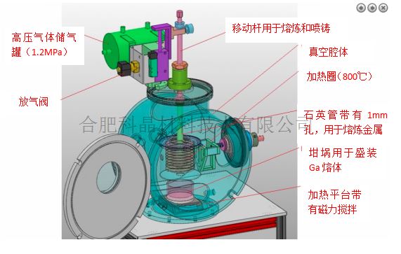 | 真空腔體&加熱器 | ·SS304不銹鋼真空腔體:Φ350mm×350mmH(內腔尺寸) ·電阻絲加熱線圈,最高溫度可達800℃ ·內徑16mm石英管(底部帶有直徑1mm孔)作為熔煉坩堝 ·儲氣罐容積:2L 耐壓1.2MPA ·1MPa惰性氣體(建議用He)將熔融材料從坩堝底部噴出到液體鎵中 |