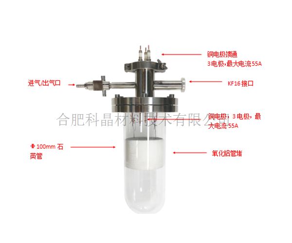 | 反應(yīng)器 | ·石英管:100 外徑x 94 內(nèi)徑 x 210 長度 (mm) ·3個銅電極 (?2.38mm) ,帶有銅連接器 ,可連接任何電極,最大電流55A f ·DN16KF接口,作為出氣口或連接真空泵接口 ·Φ6.35通氣接口 ·最大真空度: 10-2 torr (采用機械泵)or 10-5 torr(采用分子泵系統(tǒng)) ·最大可承受壓強:0.02MPa ·配有一個氧化鋁管堵 |
