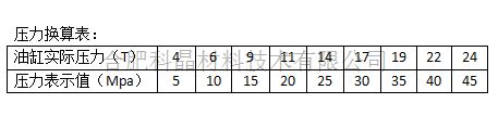 | 油缸壓力換算 | ·注:對照表為實測數據,如需其他壓力值,可參考本公司推算的計算公式。 油缸壓力(T)=壓力表示值(MPa)* 系數 0.55 |