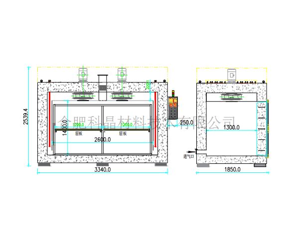 ·烘箱頂部安裝有2臺熱循環電機(每臺功率2.2KW),風扇葉片材質為304不銹鋼 ·烘箱后側有一個進氣口 ·烘箱頂部有一個排風口