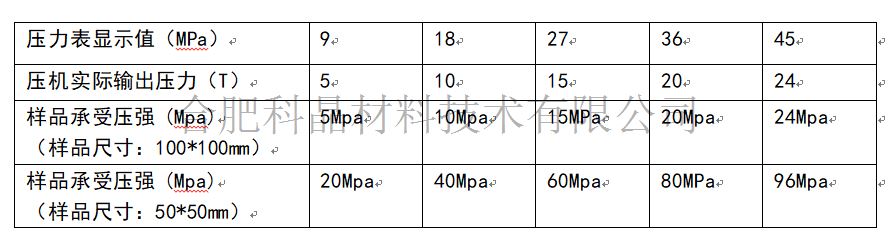 | 壓力控制系統 | ·手動油壓機 ·油缸直徑:φ79mm; ·油缸行程:25mm; ·最大工作壓力和壓強:24T同時樣品實際承受壓強值≤100Mpa; ·手動加壓,標配機械壓力表顯示壓力,可選配數顯壓力表顯示壓力 ·壓力表顯示值、壓機實際輸出壓力和樣品實際承受壓強對照表如下 ·對照表中壓力表顯示值和壓機實際輸出壓力是實測數據,如果需要其它壓力值,可以參考本公司推算的公式: ·壓機實際輸出壓力(T)=壓力表顯示值(MPa)* 系數 0.55 ·樣品承受壓強請根據不同樣品尺寸,根據壓強=壓力/面積公式進行計算得到; ·在不超過機器最大工作壓力24T的前提下,樣品實際承受壓強值必須≤100 Mpa,否則容易損壞機器的上下壓板。 |